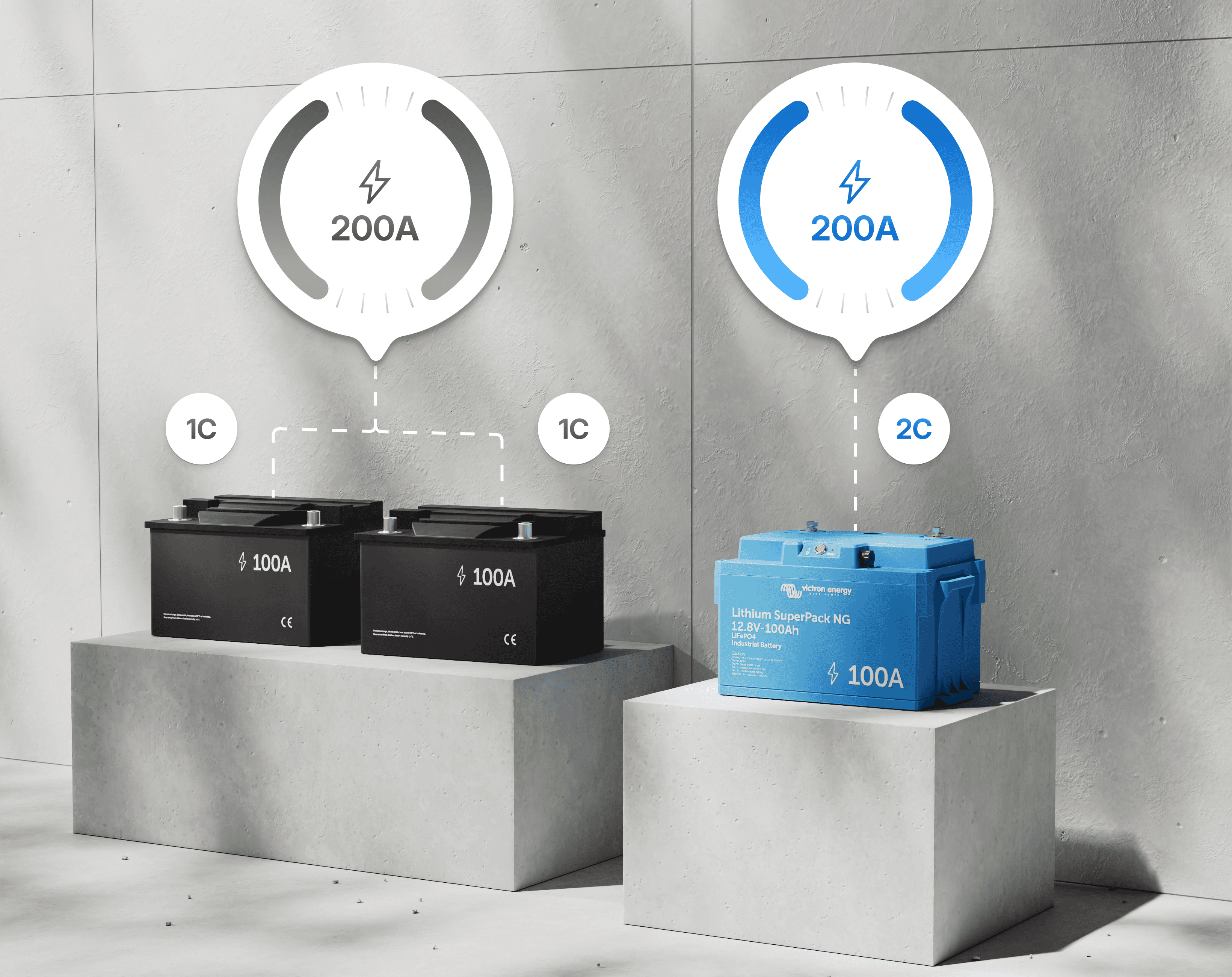 Dimensionnez pour les besoins énergétiques, pas pour les pics de puissance. Avec des courants de décharge allant jusqu'à 2C, le SuperPack NG peut fournir le double de sa puissance nominale à tout moment, gérant les charges qui nécessiteraient généralement des unités plus grandes ou plus nombreuses.