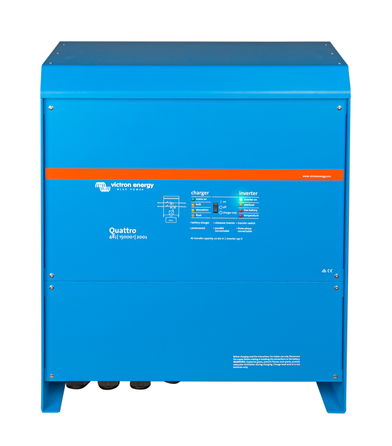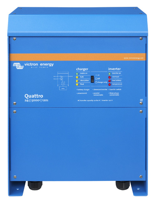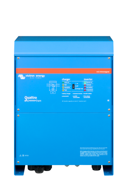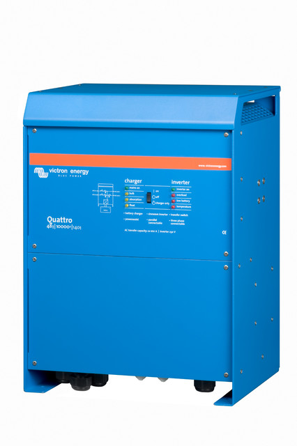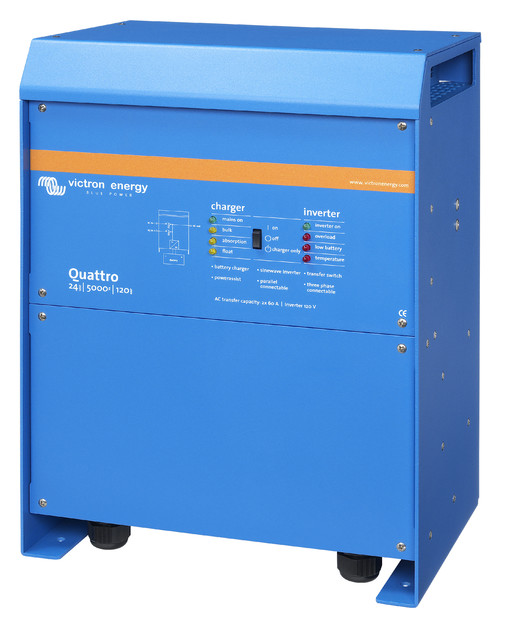 Semblable au MultiPlus, le Quattro combine également un ensemble convertisseur et chargeur. De plus, il peut accueillir deux entrées CA et connecter automatiquement la source active. Parmi ses nombreuses fonctions, il inclut un convertisseur à sinusoïde pure, une charge adaptative, une technologie PowerAssist hybride, ainsi que des fonctions d'intégration de systèmes multiples telles qu'un fonctionnement en mode triphasé, en phase divisée et parallèle.