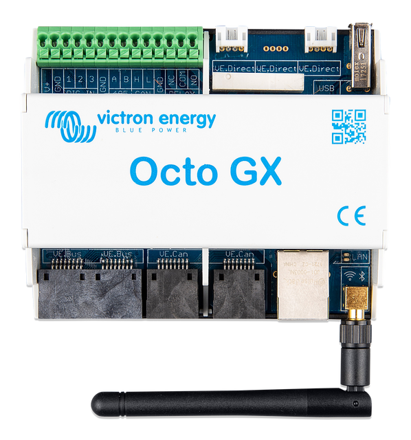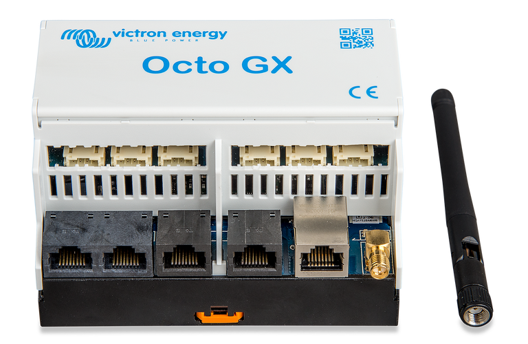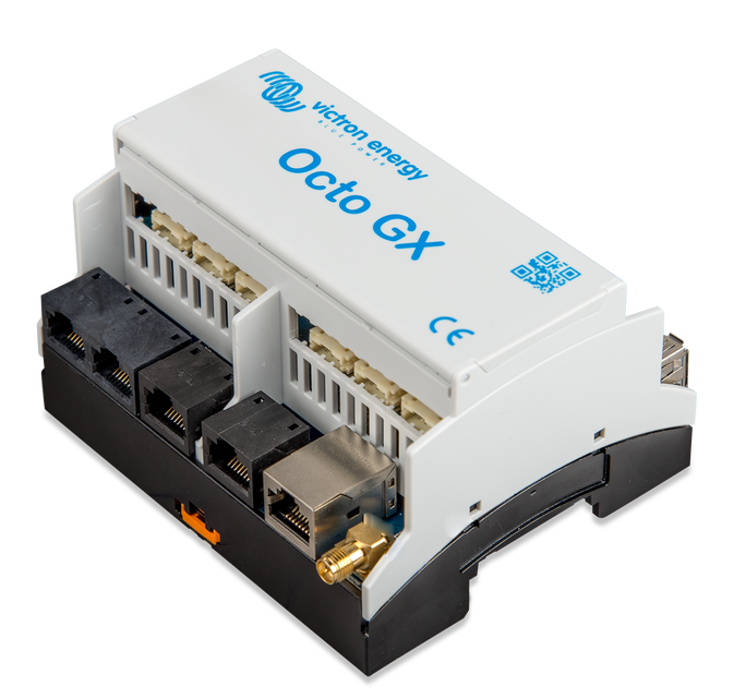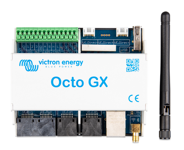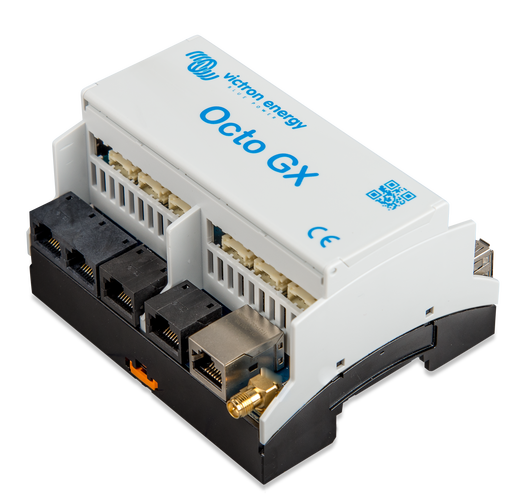 L'Octo GX est un membre de la famille des produits GX. L'Octo GX est la solution qui s'adapte le mieux aux installations disposant de nombreux chargeurs solaires MPPT, puisqu'il est équipé de 10 ports VE.Direct.