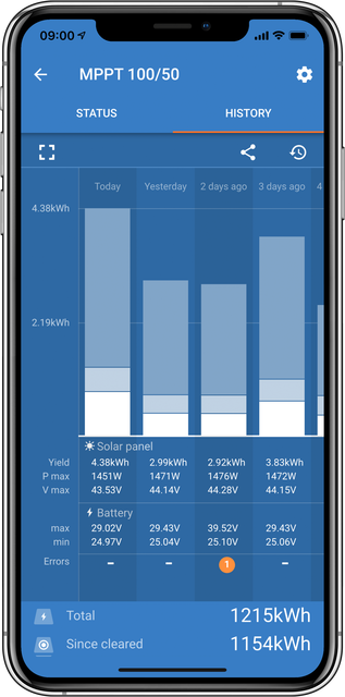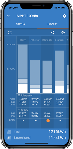 Contrôler et superviser à distance les multiples fonctions de votre chargeur SmartSolar MPPT en raccordant une clé électronique Bluetooth et en l'associant à votre smartphone ou tout autre appareil à travers VictronConnect. Si votre installation est connectée à internet, le Portail de gestion à distance de Victron (VRM) vous permet d'accéder à toute la puissance de votre MPPT, n'importe quand, n'importe où : les deux services sont gratuits. Pour des installations à distance — sans connexion à internet ni de signal téléphonique à proximité — vous pourrez éventuellement surveiller votre MPPT en l'associant par Bluetooth à un appareil disposant de la technologie LoRaWAN(réseau étendu à longue portée), disponible en option.