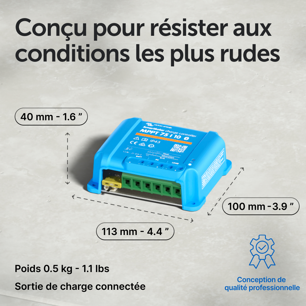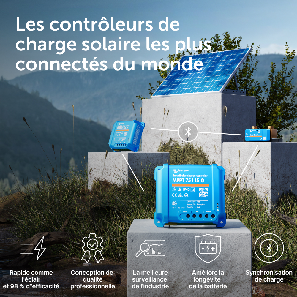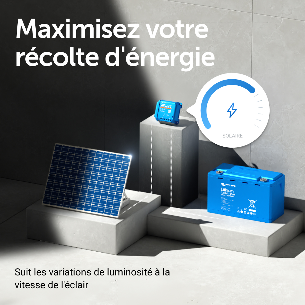 Le SmartSolar MPPT extrait chaque fragment d'énergie du soleil, même dans des conditions partiellement ombragées. Un suivi du point de puissance extrêmement rapide et des algorithmes de charge intelligents rendent cela possible.