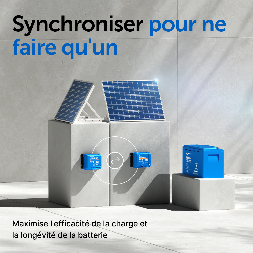 Devenez encore plus autonome en synchronisant plusieurs SmartSolar MPPT pour qu'ils fonctionnent comme un seul. Cela améliore la production solaire, optimise les performances du système et prolonge la durée de vie de la batterie.