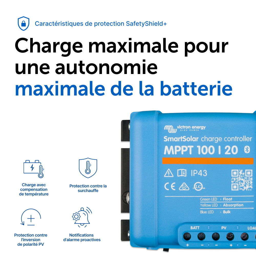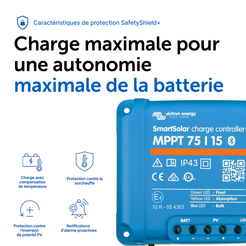 Le SmartSolar MPPT donne la priorité à l'entretien de la batterie grâce aux fonctions SafetyShield+ intégrées, basées sur des décennies de savoir-faire en matière de batteries. Celles-ci comprennent la charge compensée en température, la protection contre la surchauffe et les protections contre les courts-circuits PV, l'inversion de polarité et le courant inverse.